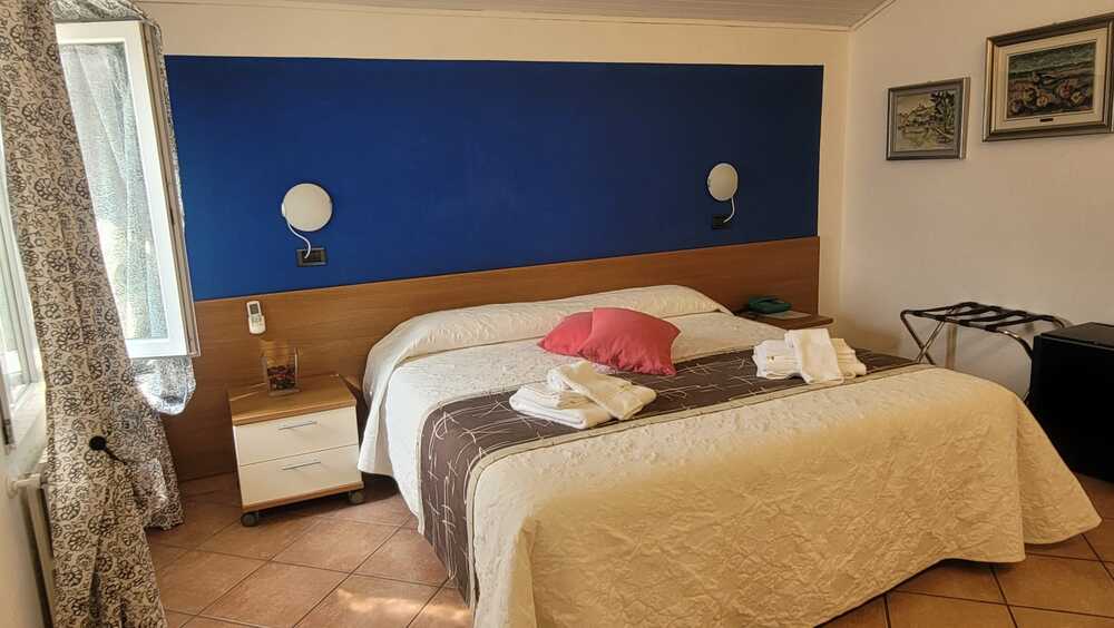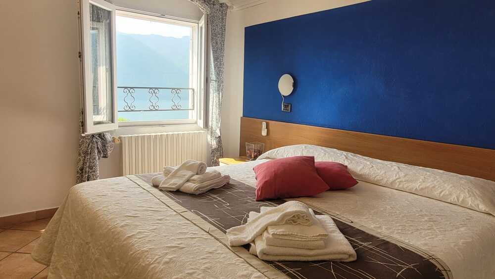 The classic lake view room with private external bathroom adjacent to the room offers a comfortable environment, characterised by the colour blue, splendid paintings depicting landscapes and characteristic places of Monte Isola and classic furnishings.